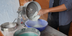 蛋殼回收業者李彥潁先生說明,他們在鹹蛋場會架設一條流水線把這些蛋殼的表面髒汙洗掉,把鹽分、紅土的殘留洗掉以後,再把它粉碎然後乾燥。
