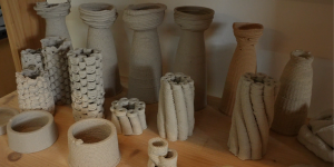 蛋殼回收業者李彥潁先生解釋道,他會先把蛋殼混入陶瓷以後做3D列印,把它印出一個一個花器。但這個過程裡面,一個作品它假設是 100 克,其實只用了大概5克左右的蛋殼粉末,用量非常少,所以對他們來說,是遠遠沒辦法消滅這些空間的東西。