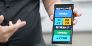 除了智慧導盲杖,團隊還開發了一款手機應用程式搭配使用,讓視障人士外出時對環境更了解、行動更方便。這款應用程式主要針對半盲的視障人士設計,張竣皓表示:「他使用上可能看不到,所以我們在設計上都是非常大圖塊式,而且有明顯顏色對比。一般視障人士在使用的時候,基本上是拿著手機,連接藍牙耳機,然後去聽這個音效。」